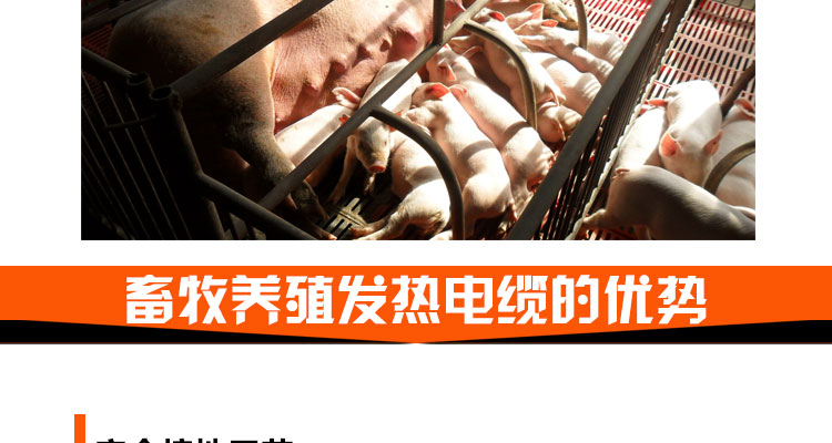 發(fā)熱電纜廣泛應(yīng)用于養(yǎng)殖場分娩舍、保育舍的采暖,高質(zhì)量的發(fā)熱電纜產(chǎn)品,使用非常安全可靠,避免了極冷冬天因天氣寒冷造成的乳、幼豬凍傷、凍死事故發(fā)生以及傳統(tǒng)的紅外線燈加熱溫度過高帶來的灼傷。相對于傳統(tǒng)的采暖,環(huán)瑞發(fā)熱電纜具備很好的優(yōu)勢。